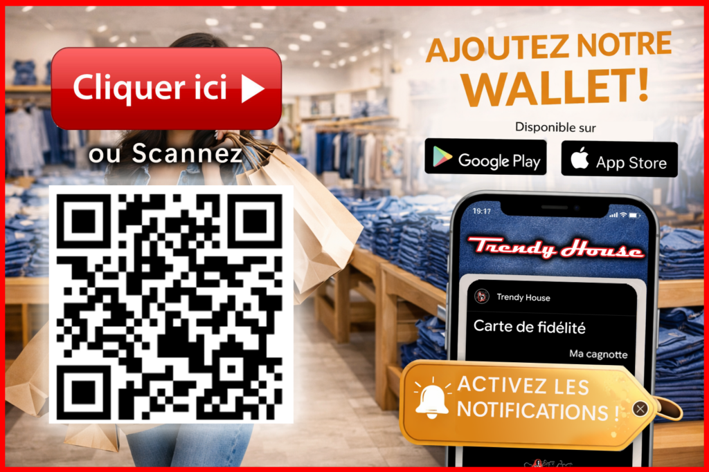Ajoutez la carte de fidélité Trendy House directement sur votre smartphone et profitez facilement de vos avantages en boutique.
